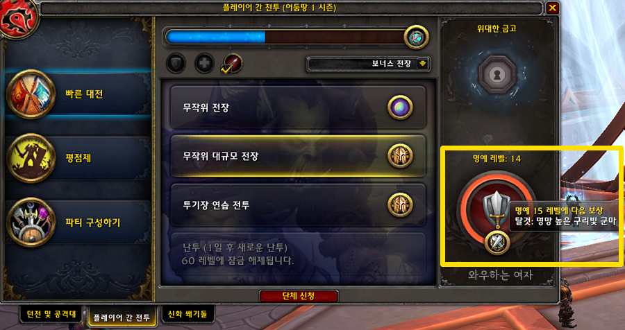 명예 레벨 14 달성하고부터는 왠지 욕심이 생겨 15 찍으려고 이틀내내 쐐기도 내팽개치고 전장만 뛰었어요 ㅎㅎ