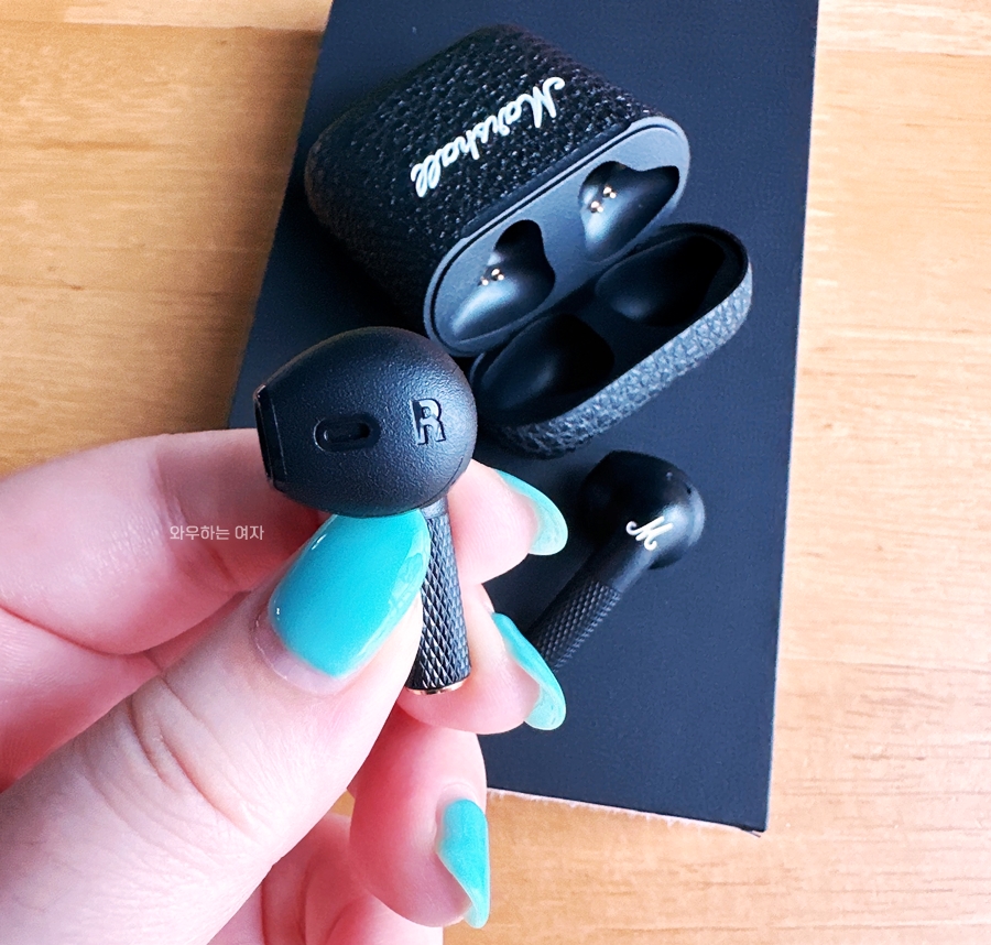 게다가 귀에 꽂고 있을 때 누가봐도 '마샬'을 착용했음을 알려주는 미니멀한 'M' 로고까지 예뻐요. 보편적으로 이런 류의 기기는 화이트가 압도적으로 인기가 많은데, 마샬만큼은 블랙이 압승인 것 같아요.