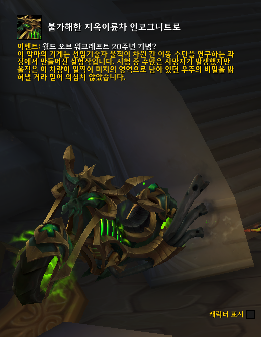 와우 20주년 기념 이벤트로 오픈된 '래츠의 복수' 수수께끼가 보주 9개까지 다 풀렸다는 소식을 듣고 3일간 매달린끝에 저도 뒤늦게나마 불가해한 지옥이륜차 인코그니트로, 지옥 오토바이를 갖게 되었습니다.