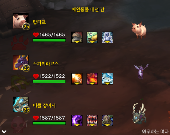 와우 포션에서 추천 펫으로 <스파이라고스 - 넬타라 - 버들강아지> 를 추천했지만, 저는 탑타프 - 스파이라고스 - 버들 강아지 순으로 대전했습니다. 이 구성으로 진행하여 원트에 성공하였으니 넬타라 영입이 어려운 분은 탑타프도 강력하게 추천드립니다.