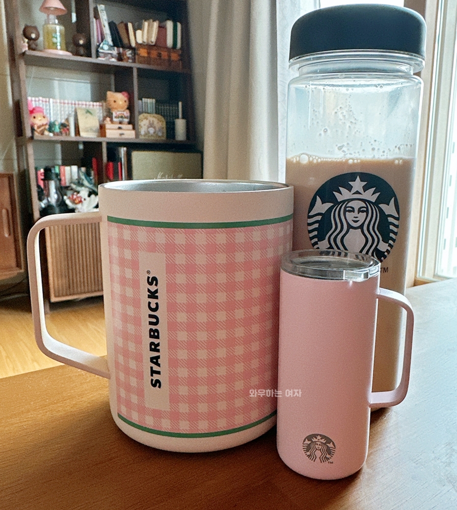 🩷 키링과 함께 찍은 예쁜 핑크체크 머그컵 - 스타벅스 25SS 그로서리 마켓 데비 텀블러 473ml